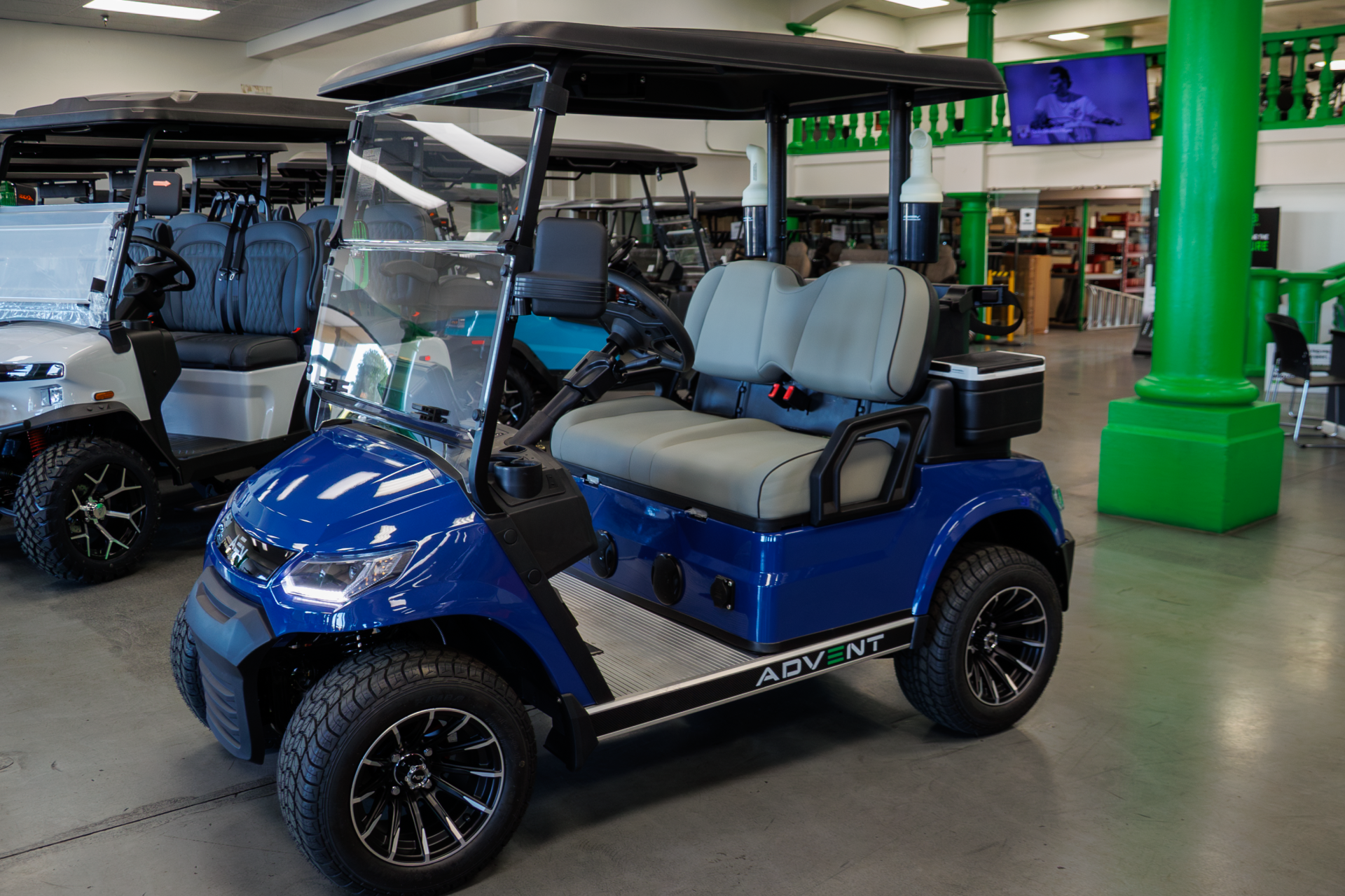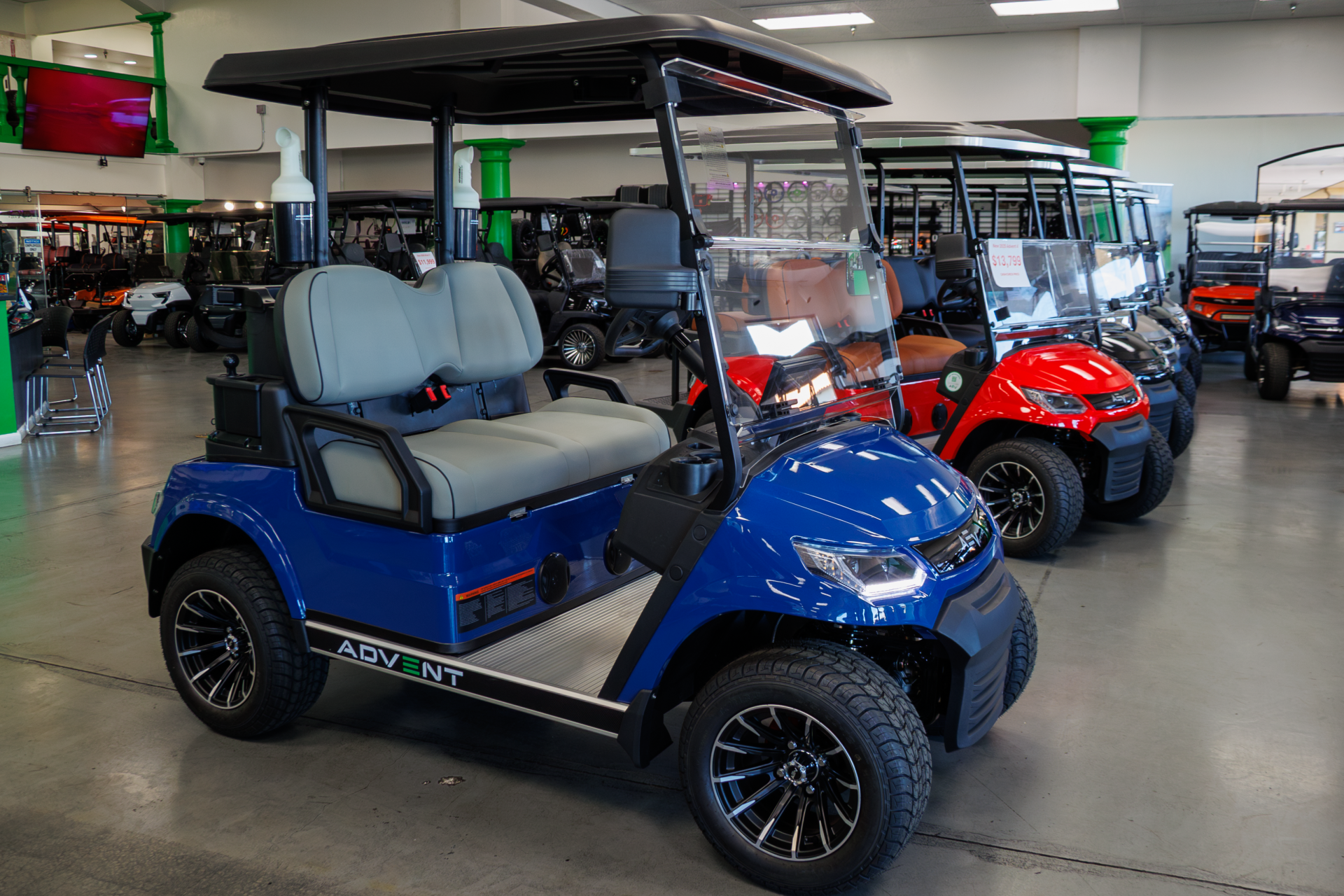 Built with durability and driver confidence in mind, the Advent 2 features four-wheel hydraulic disc brakes, independent front suspension, and bright LED lighting for dependable handling and visibility. Inside, premium touches like custom-stitched leather seating, a Bluetooth touchscreen display, backup camera, and integrated sound system create a comfortable, easy-to-enjoy driving experience in a compact electric vehicle platform.