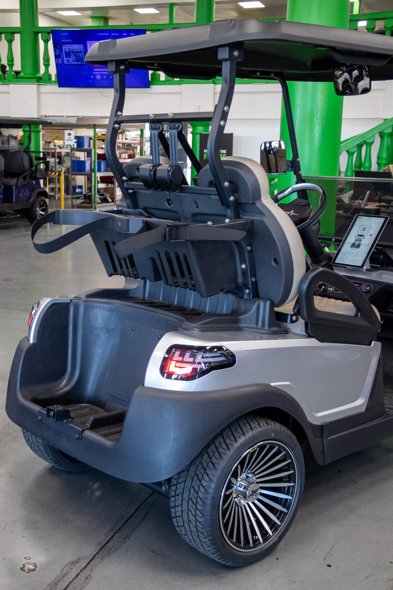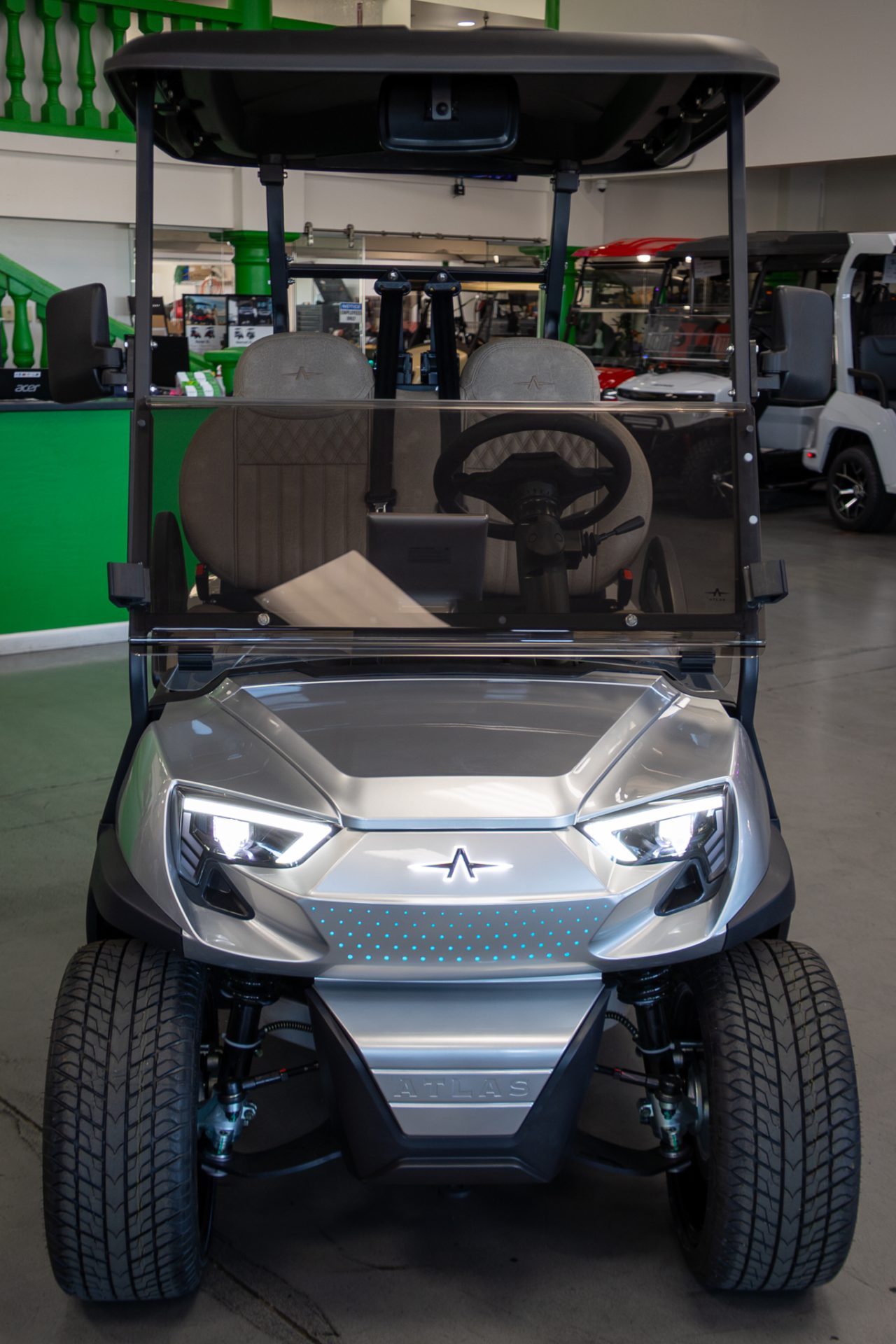 Built on a rugged aluminum chassis with coil-over shocks, the Atlas 2 offers a stable and comfortable ride while maintaining a lightweight yet durable structure. Inside, the vehicle features an impressive 12.5-inch HD touchscreen display, one of the largest in the industry, which provides real-time vehicle information such as speed, battery level, and system alerts. With premium features like wireless phone tethering, Bluetooth audio, backup camera, and wireless phone charging, the Atlas 2 combines cutting-edge technology with practical everyday convenience.
