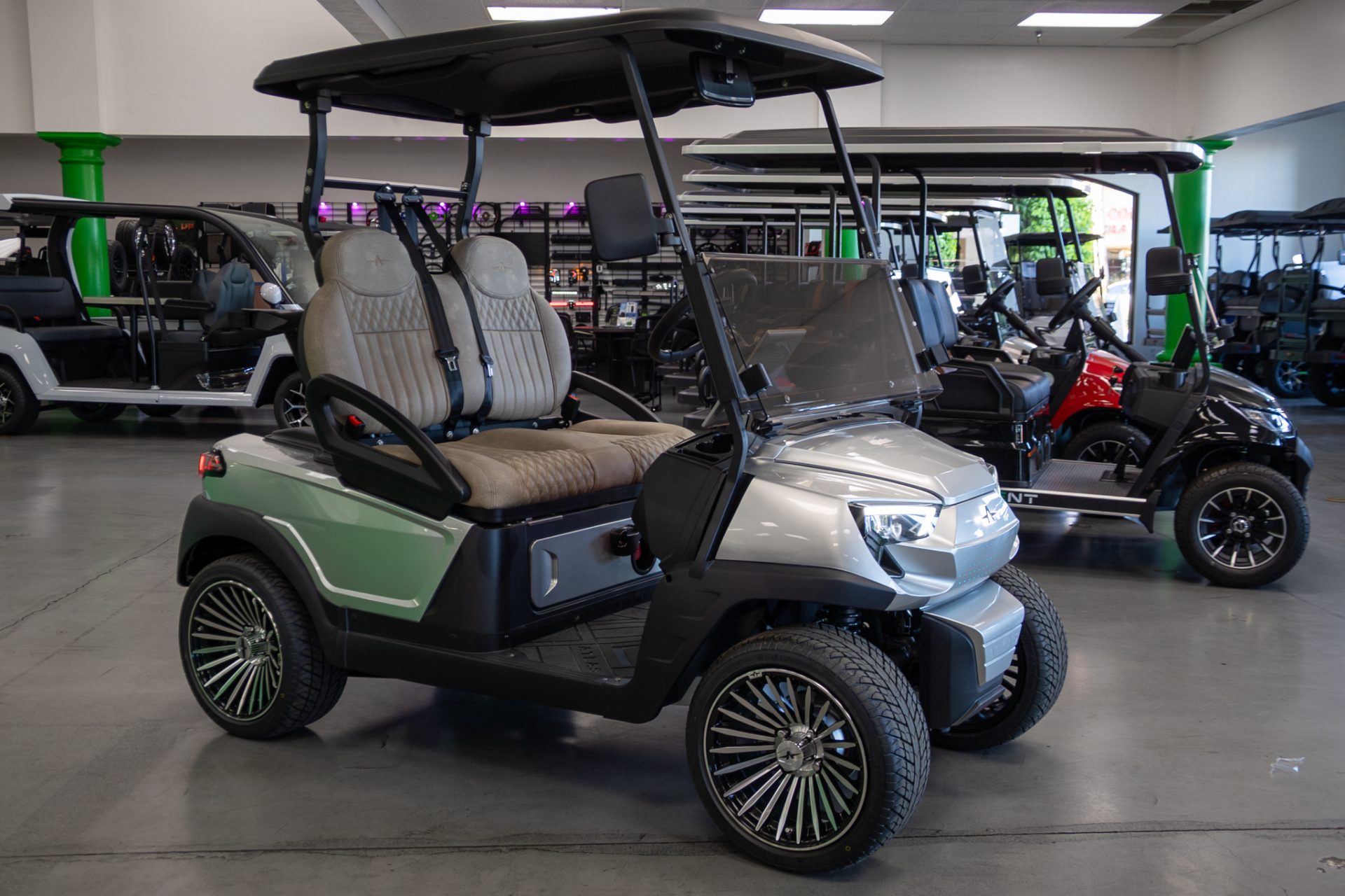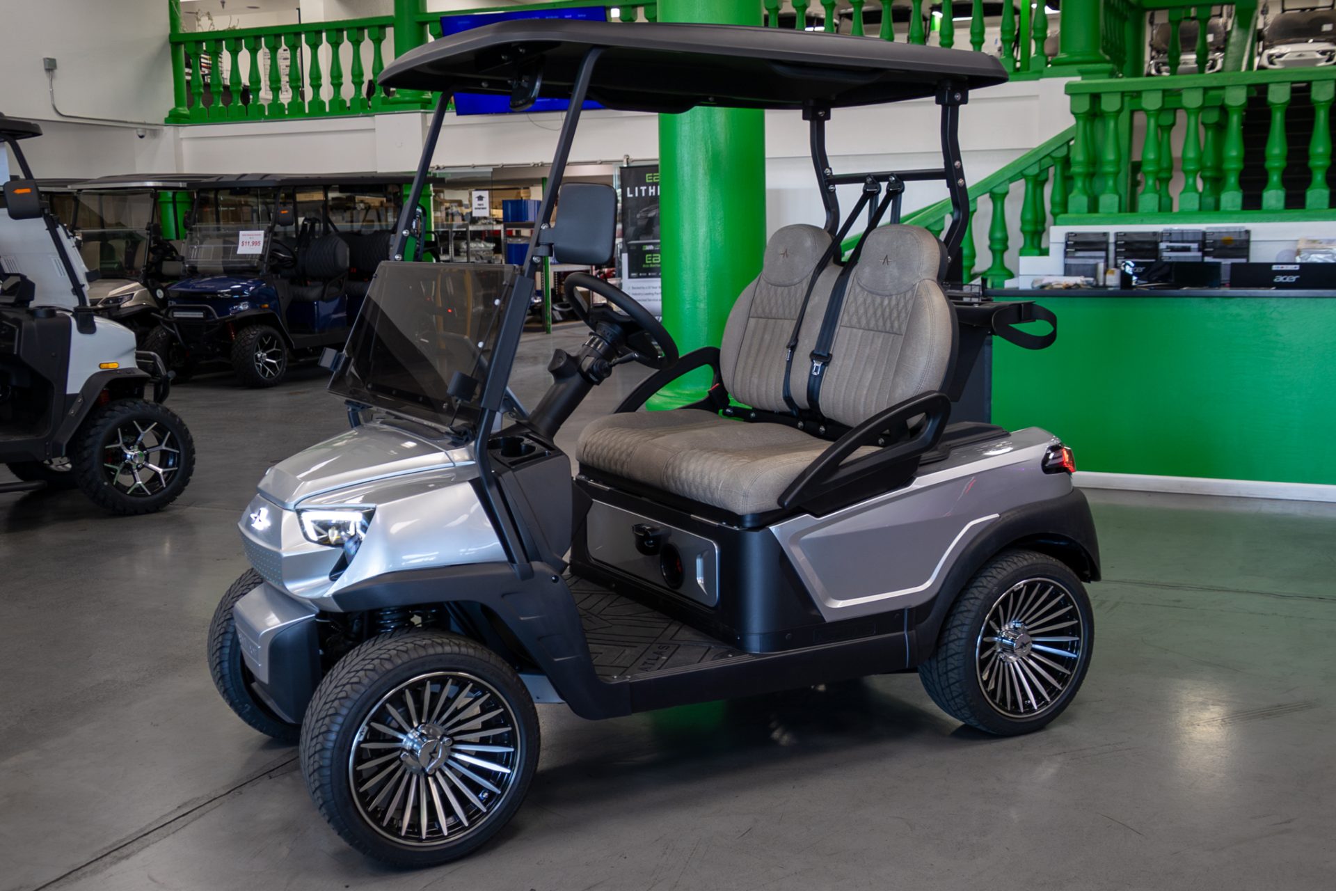 The Atlas 2 Electric Golf Cart is a premium 2-passenger lithium electric vehicle designed for smooth performance, modern technology, and everyday reliability. Powered by a powerful 5kW AC electric motor paired with a 400A performance controller, the Atlas 2 delivers responsive acceleration, quiet operation, and dependable performance for golf courses, neighborhoods, resorts, and recreational driving. Its advanced lithium battery system with onboard 110V charger provides efficient charging and long-lasting power for extended daily use.