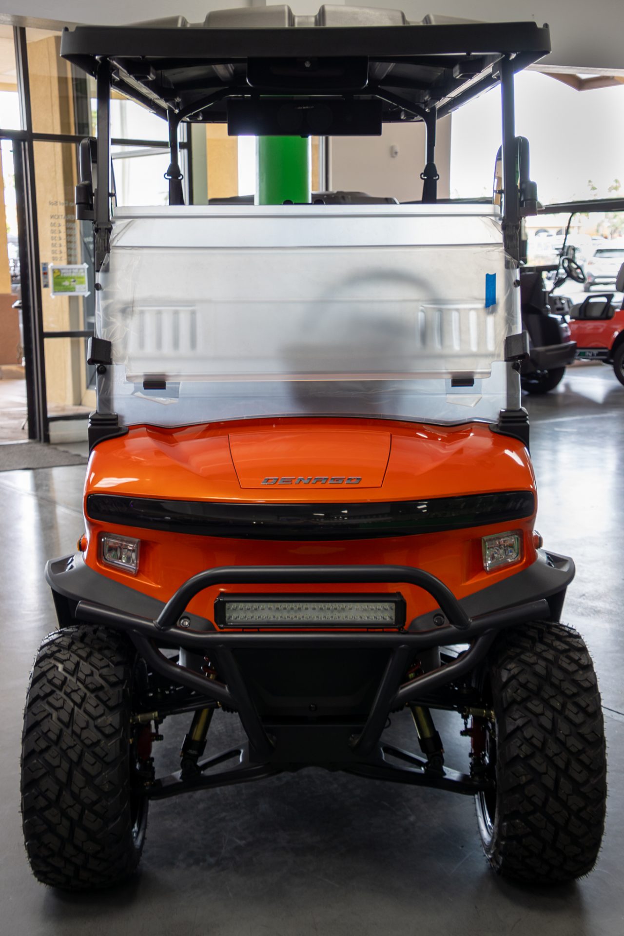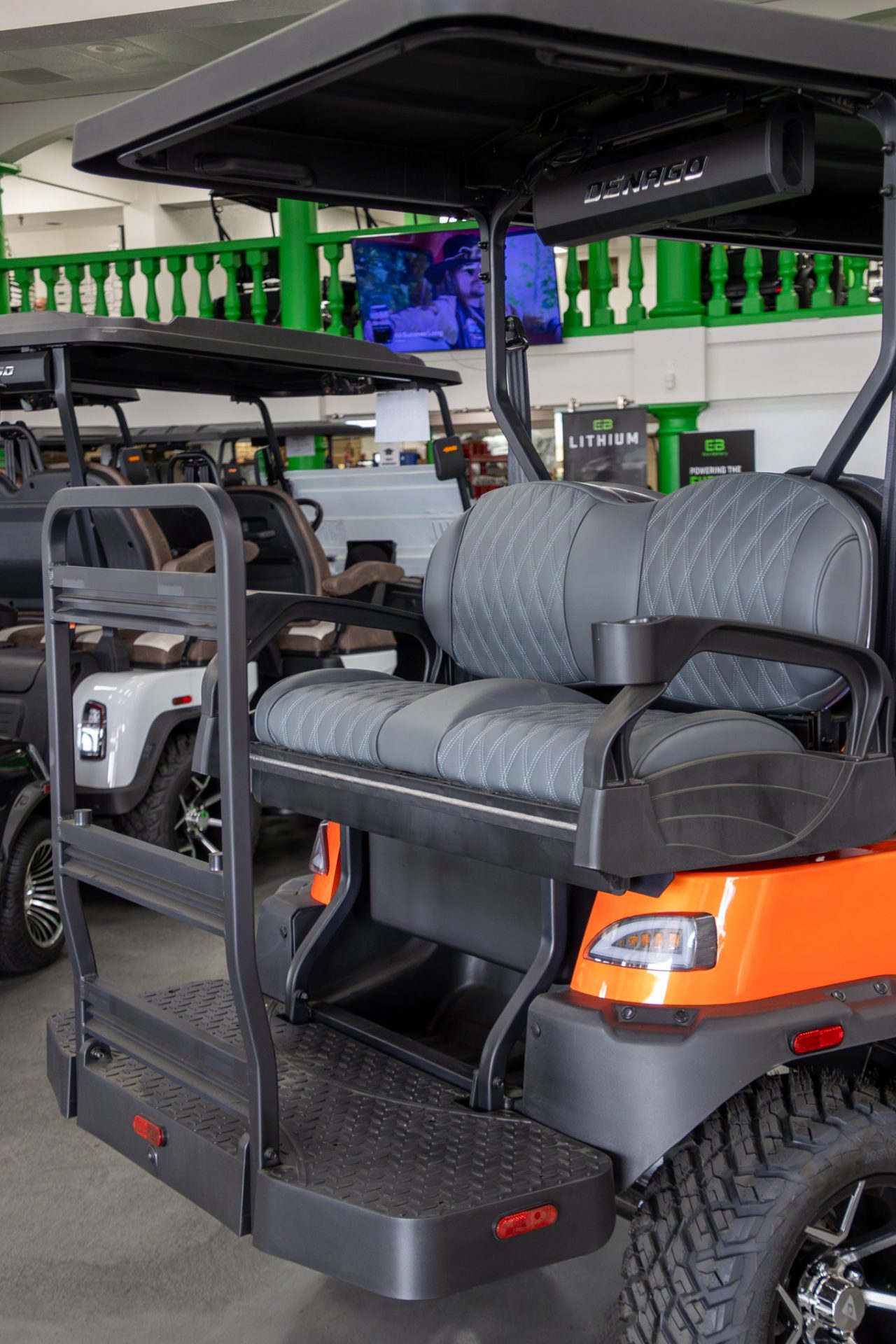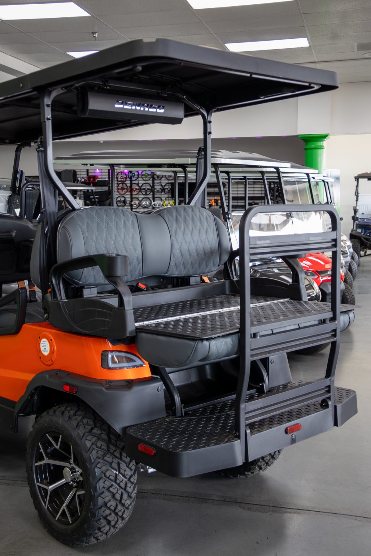 Built on a durable aluminum chassis with a factory lift, the Rover XL 6 features four-wheel hydraulic disc brakes, integrated safety lighting, and DOT-approved all-terrain tires for stability and control. Inside, passengers enjoy Denago premium seating, a 10.1-inch display, Bluetooth LED sound bar, rear backup camera, and convenient storage, creating a comfortable, easy-to-drive electric vehicle that’s as practical as it is stylish.